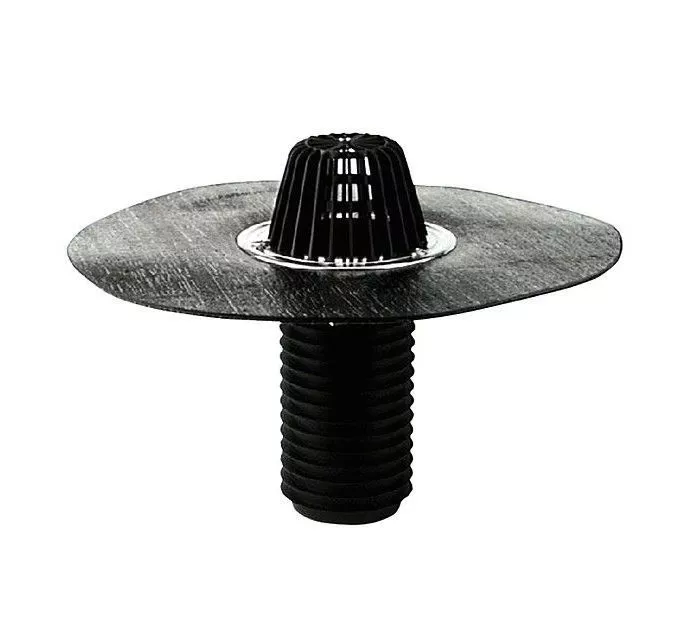 כניסה עליונה ”4 (110 מ”מ) ויציאה אנכית בקוטר ”4, חיבור מהיר לכל סוגי הצינורות. הפרט כולל תוספת צווארון ביטומני בעובי 4.7 מ”מ ובקוטר 420 מ”מ המולחם במפעל לגוף הנקז בהלחמת לייזר אינפרא אדום + תוספת חיזוק והגנה מסביב לפתח הנקז ע”י טבעת נירוסטה המחוברת ע”י ברגי נירוסטה המוברגים לתוך בתי בורג בצלחת בסיס הפלנג’ עליה מולחם צווארון הדלביט. נקז זה תוכנן ועוצב במיוחד כך שיוכל להשתלב בקלות עם כל סוג צינור אנכי (או ברך זווית 90°) בקוטר ”4 (110 מ”מ) ע”י השחלתו לתוך פנים הצינור. על מנת לקבל חיבור ואיטום מושלם בין הנקז והצינור למניעת הצפות במקרים של מים חוזרים מהצנרת (OVER FLOW), מיוצר צינור היציאה של הנקז עם רצף טבעות איטום בולטות וגמישות לכל אורכו (20 ס”מ) מגומי טרמופלסטי היצוק על צינור היציאה. ניתן להוסיף לנקז ברדס מסורג או מאריכים לריצוף + רשת לפי הצורך.